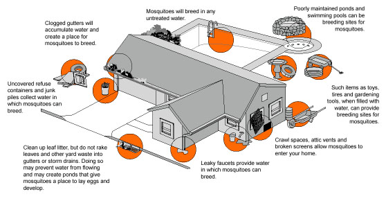 Next, it is important to know that mosquitoes are territorial by nature, and generally do not leave a 200 foot radius. This means that your mosquitoes are likely reproducing on or near your property. Please survey your property for anything that may hold standing water. Mosquitoes need standing water in which to grow and become breeding grounds for mosquitoes.